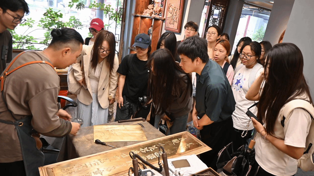 匠人老师现场演示了铜板雕刻从设计绘图到最终成型的部分流程,并娓娓道来这门技艺的历史渊源与传承脉络。他感慨道:“唯有手工技艺,方能赋予铜以真正的灵魂与生命力,这是机器永远无法企及的。”学子们不仅专注聆听老师讲解的雕刻步骤,更被匠人精益求精、追求极致的精神深深触动。他们纷纷举起相机,定格雕刻过程中的每一个精彩瞬间,用心去体悟传统工艺背后所承载的深厚文化底蕴。